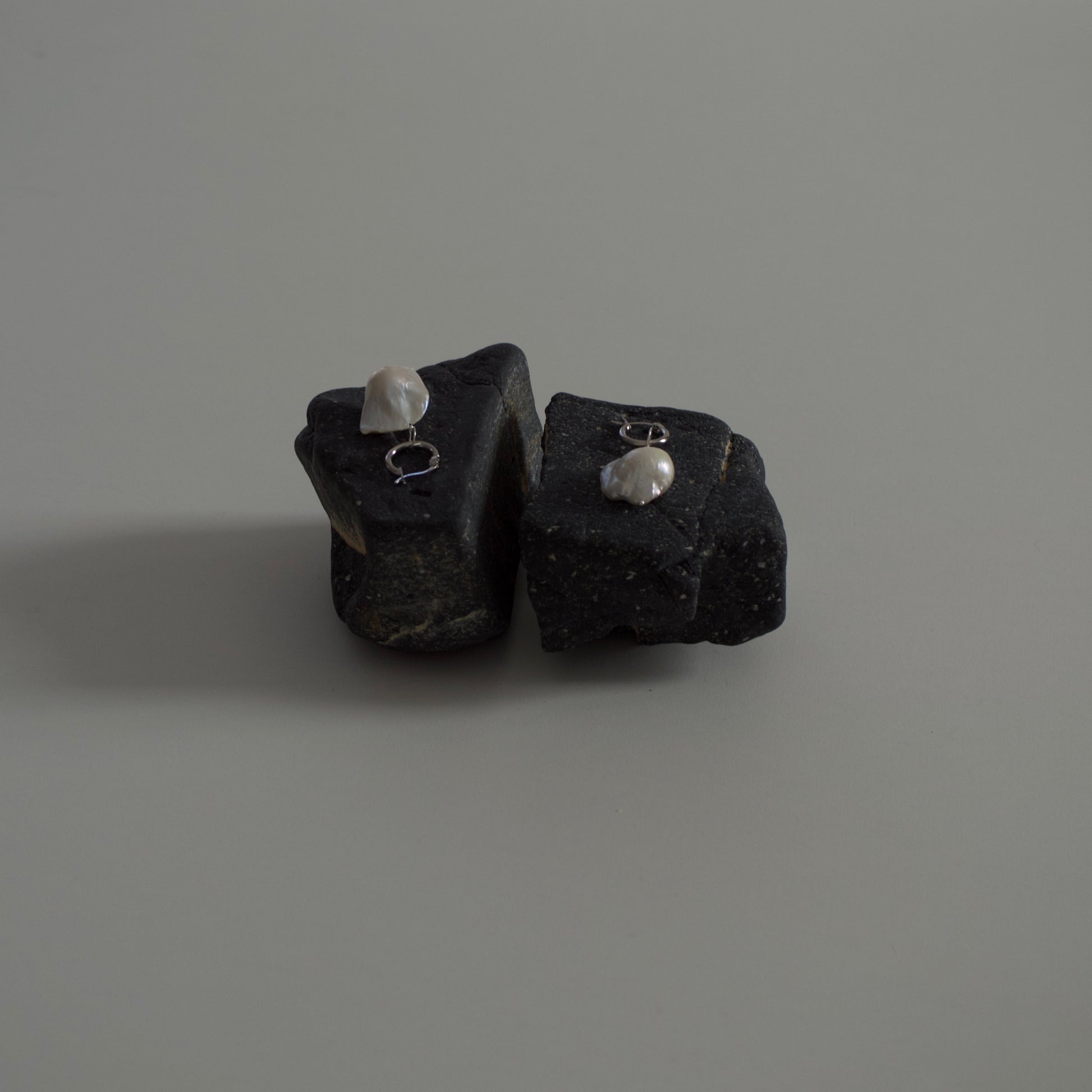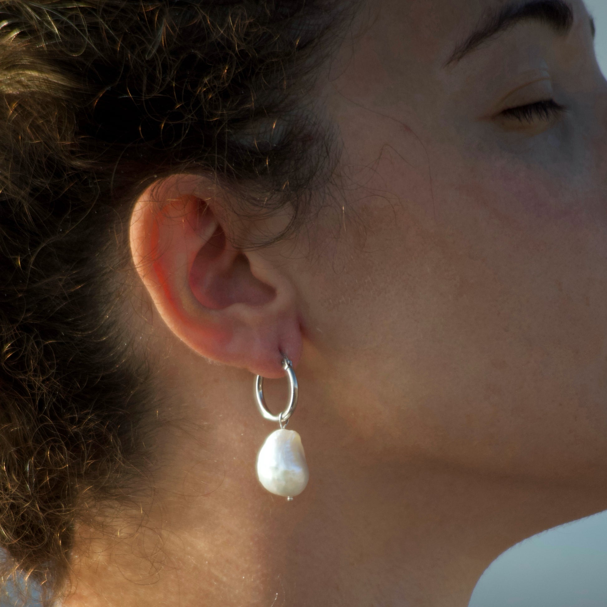 Hoop earrings with snap closure in 925 silver and baroque pearl as pendant.