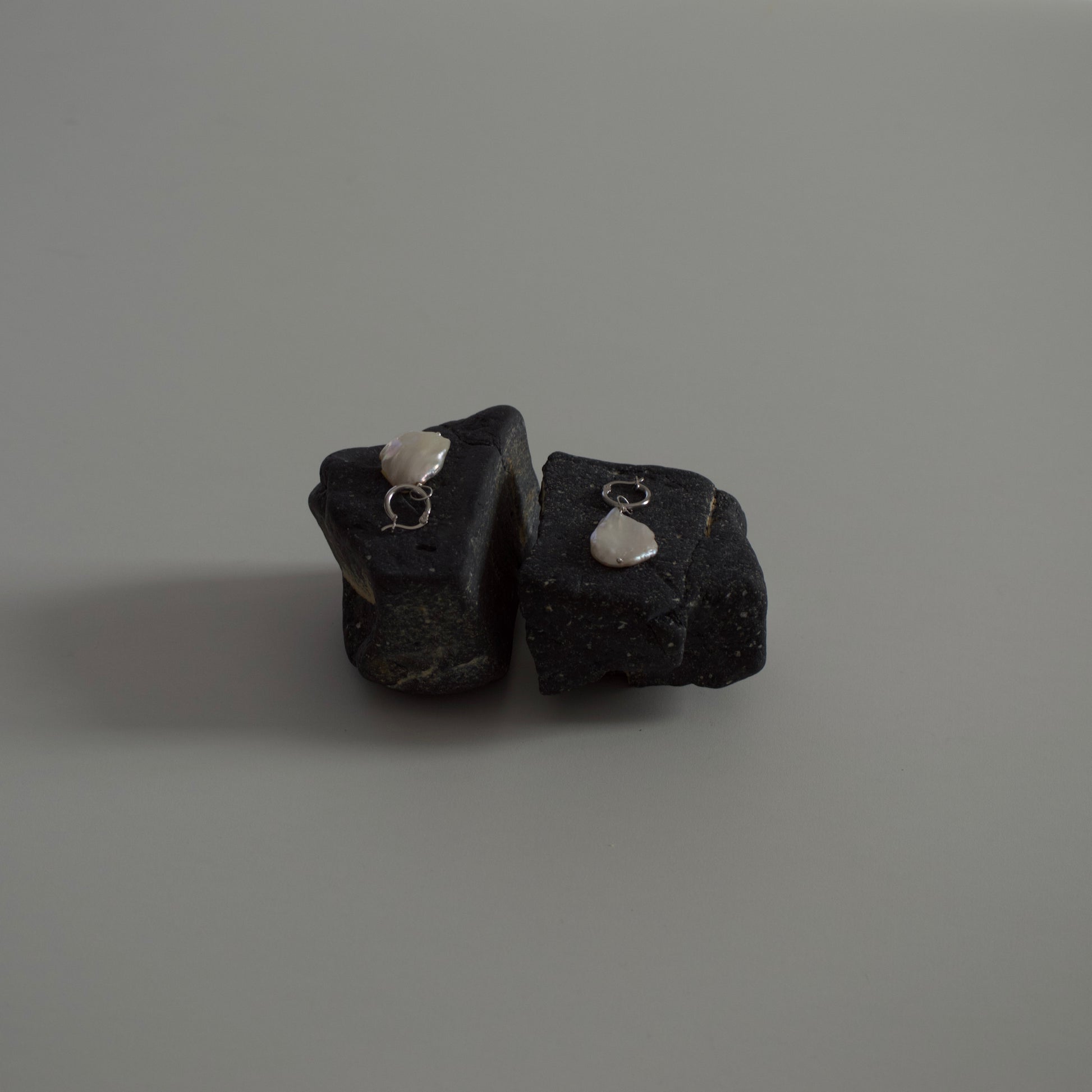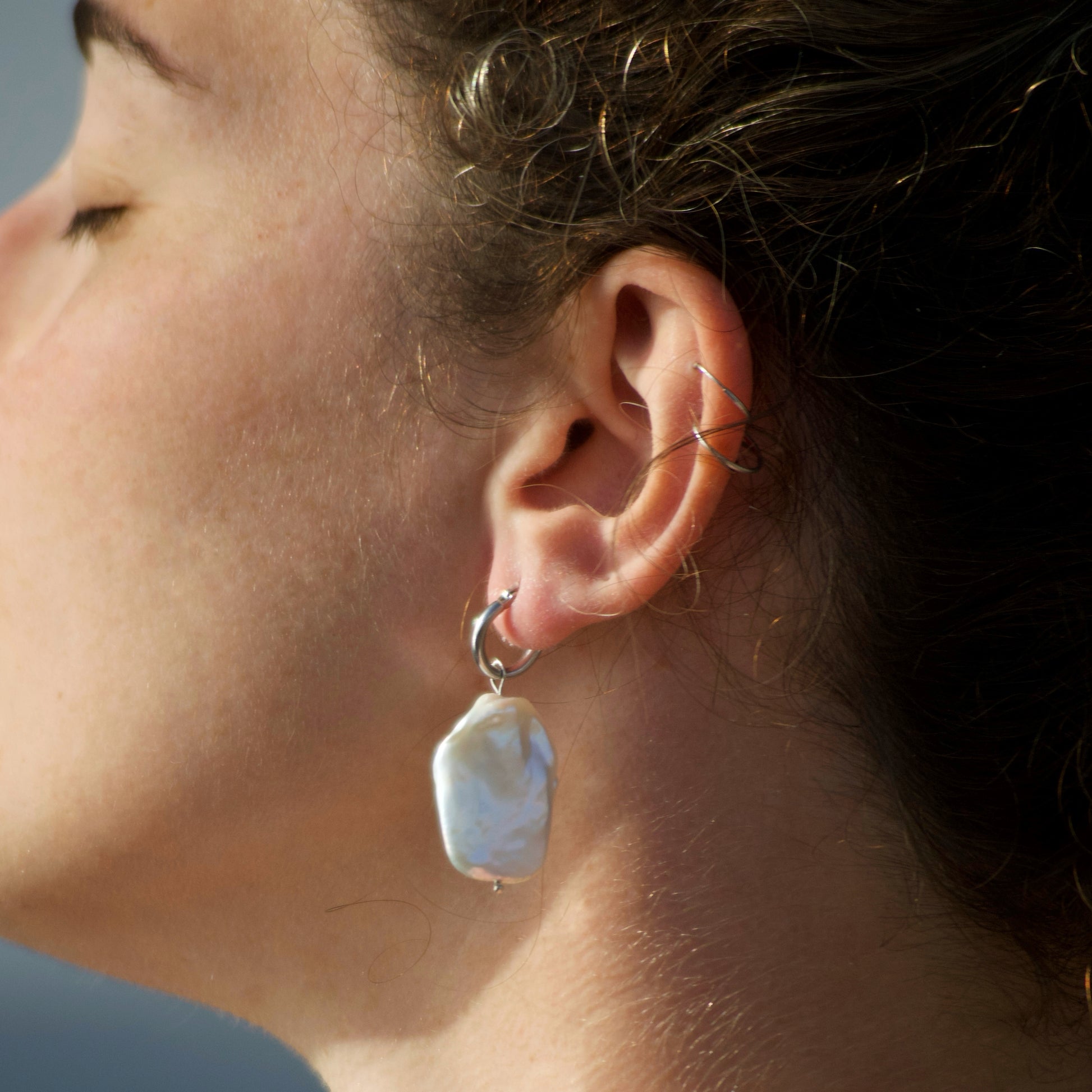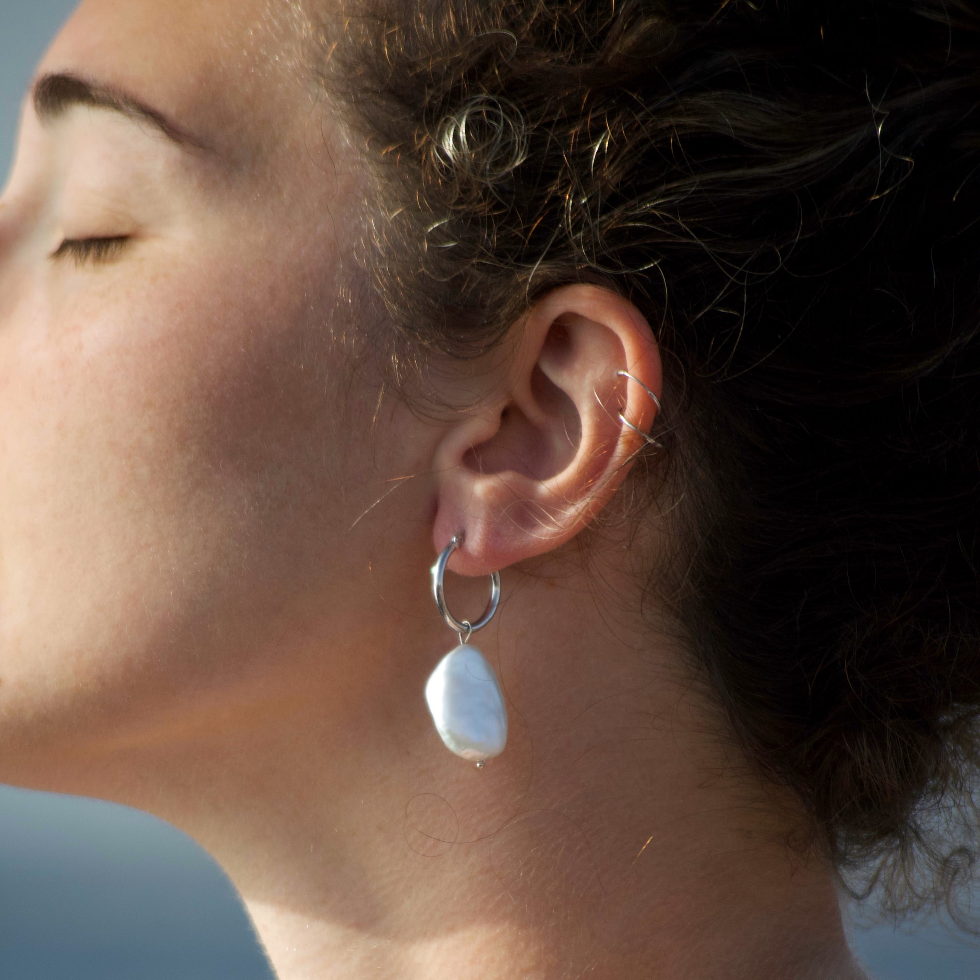 Hoop earrings with snap closure in 925 silver and baroque pearl as pendant.