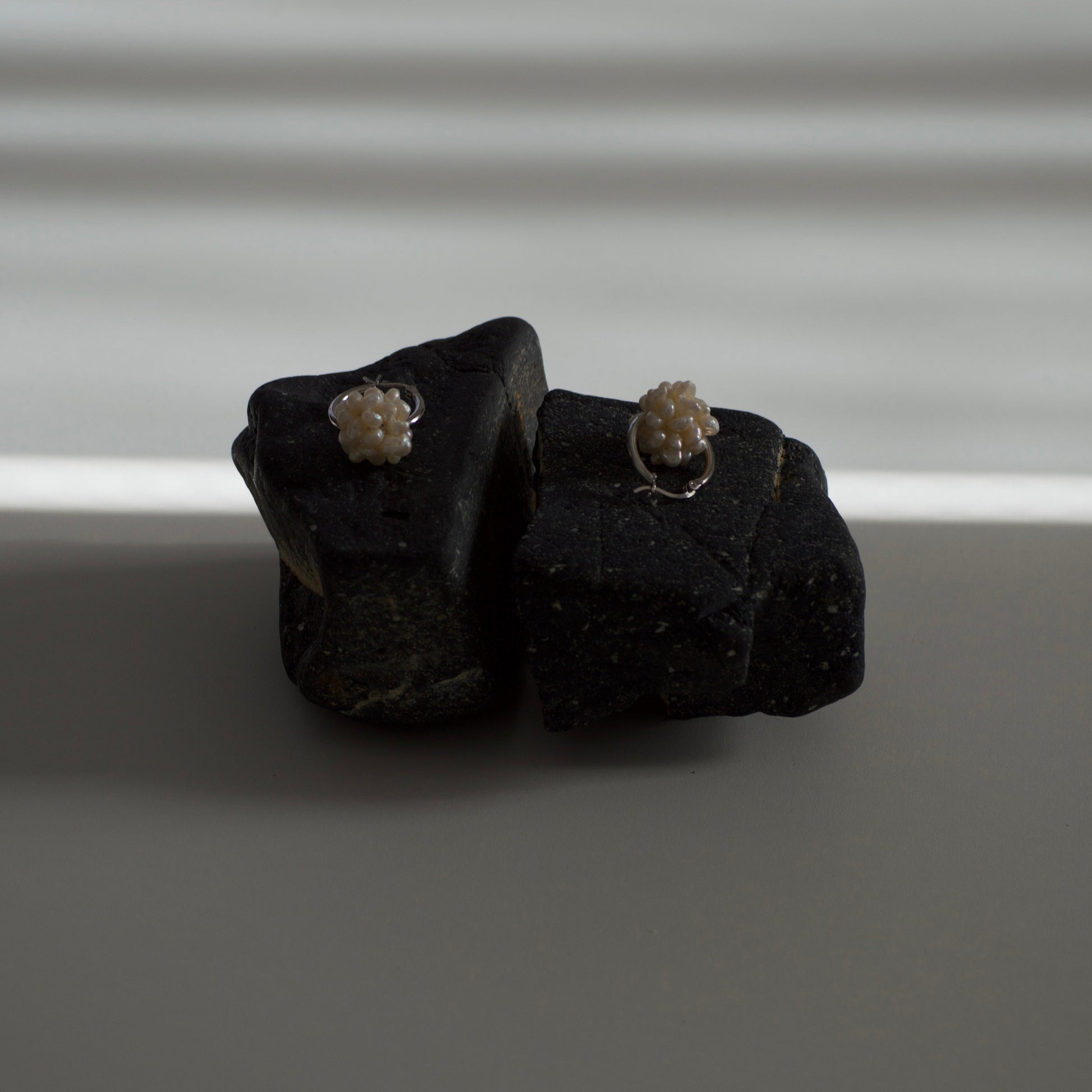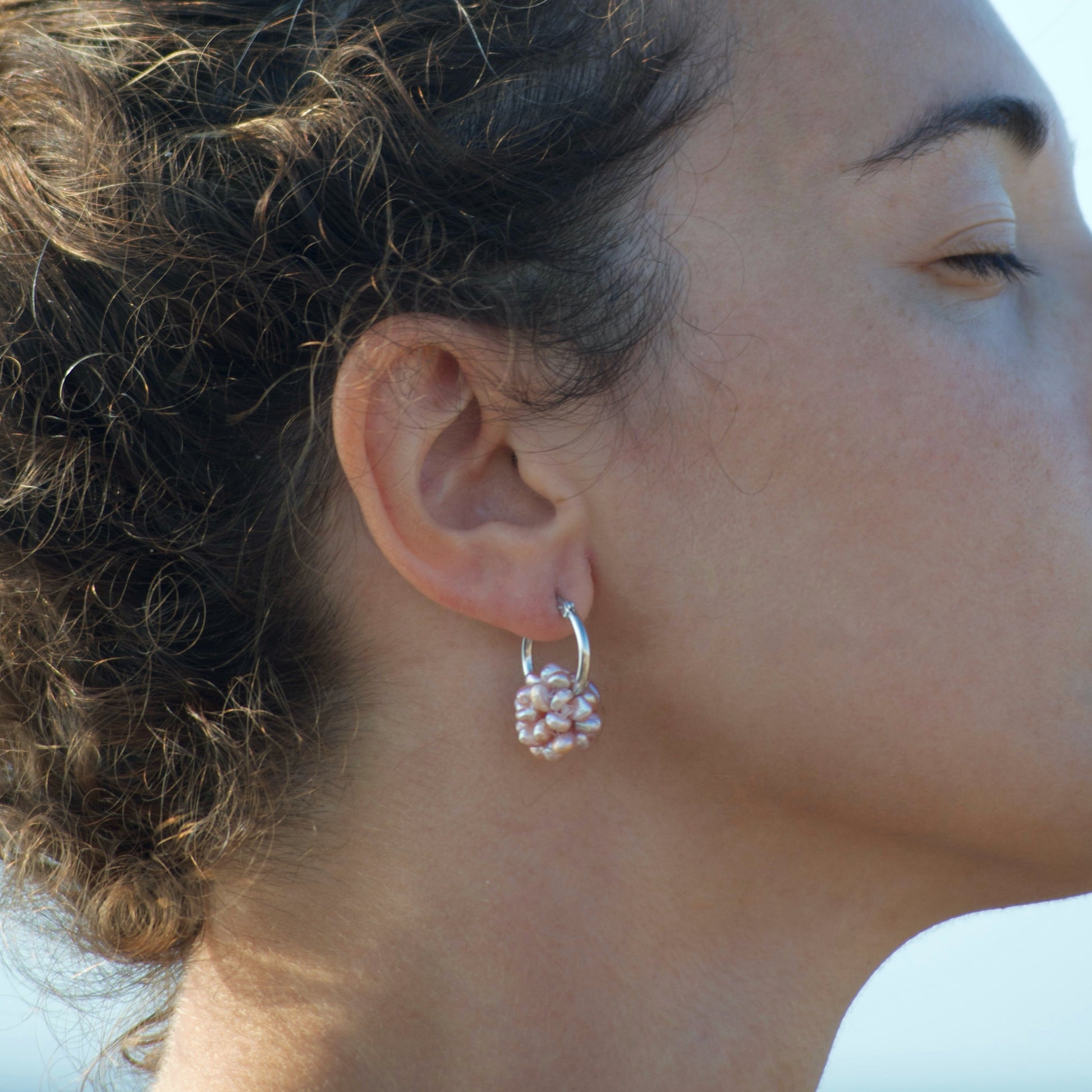 Hoop earrings with snap closure in 925 silver and rice grain pearls knotted together as a pendant.