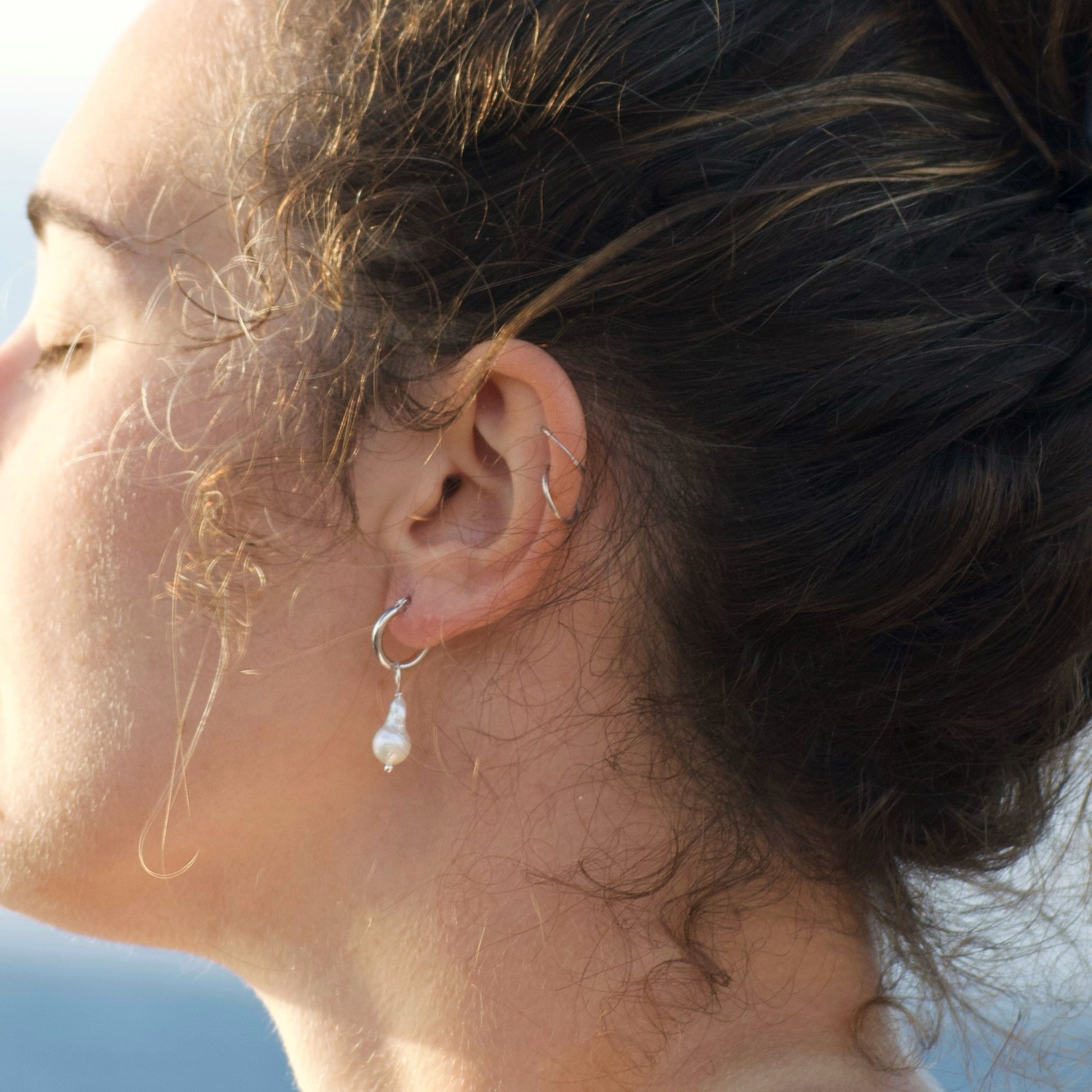 Hoop earrings with snap closure in 925 silver and baroque pearl as pendant.
