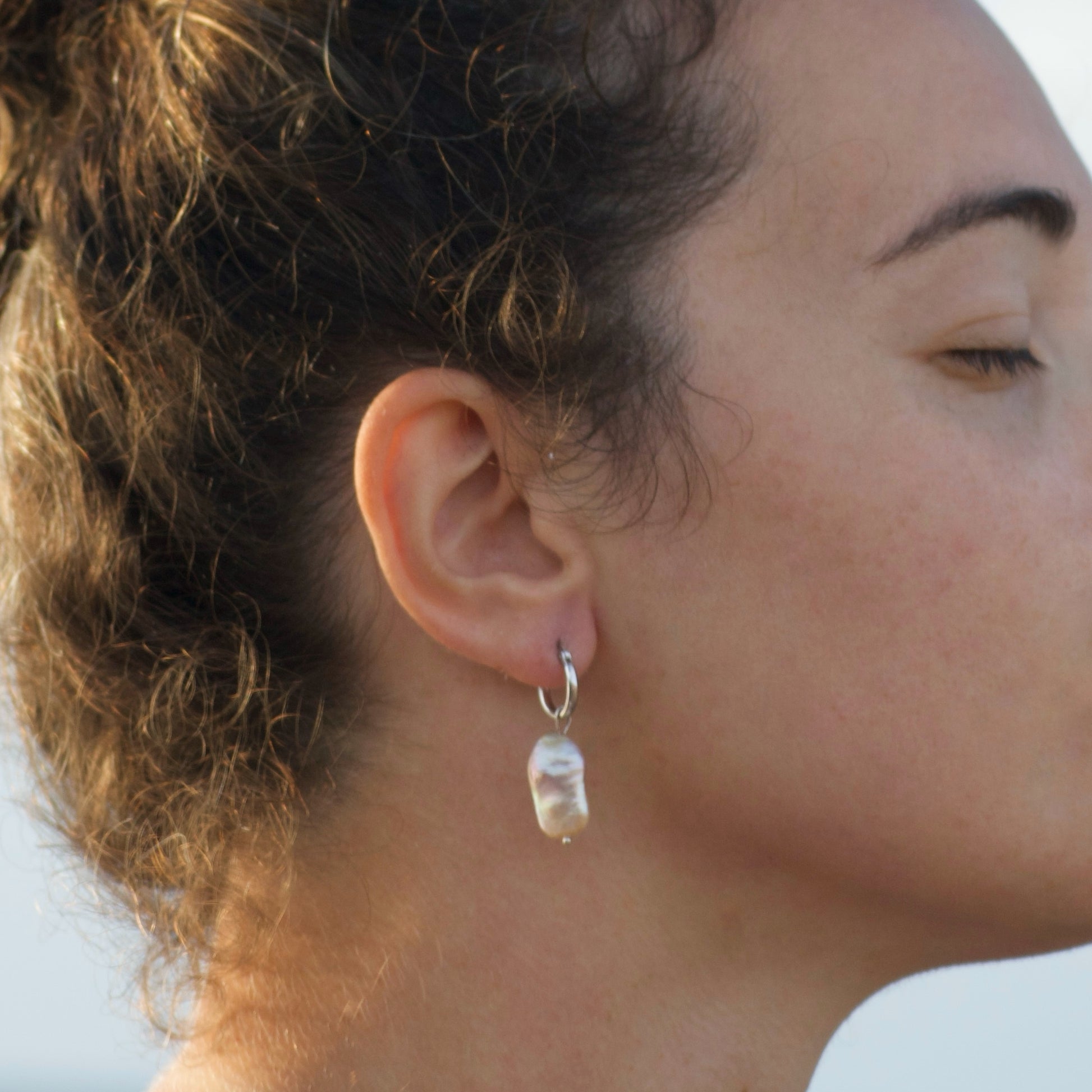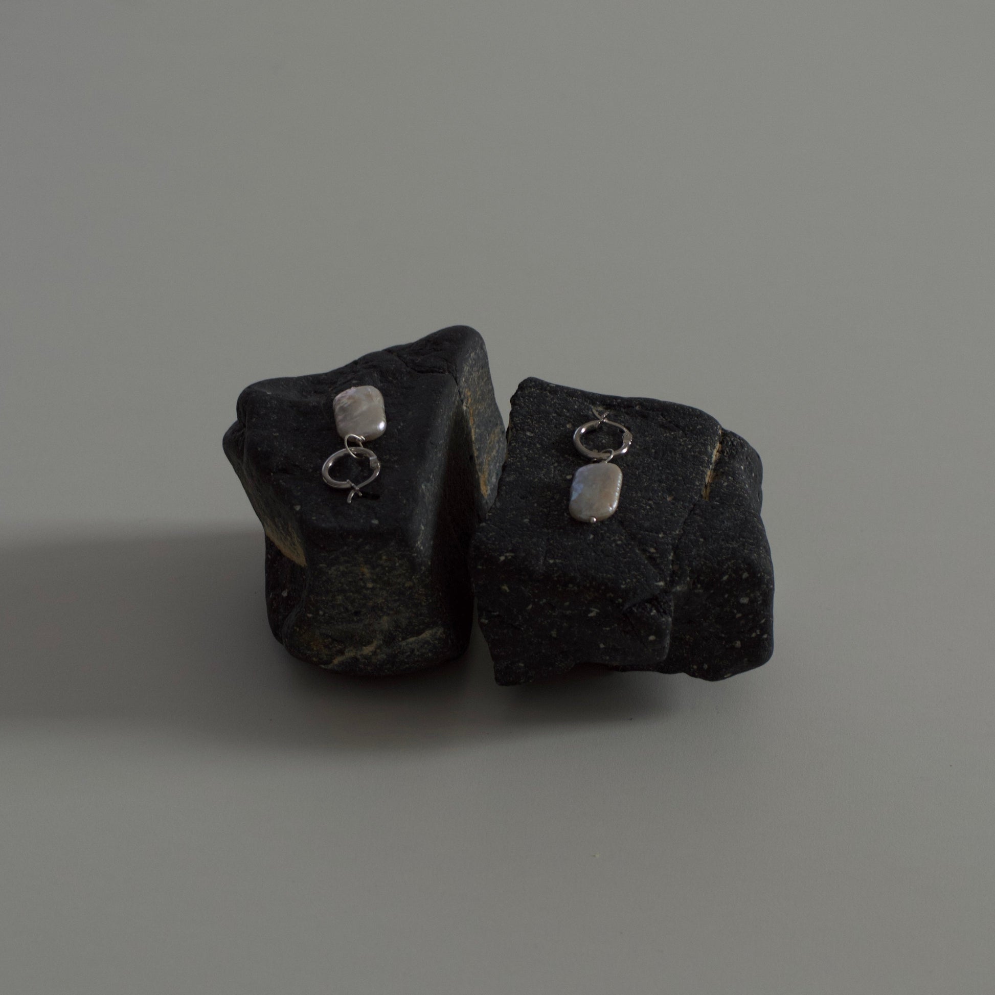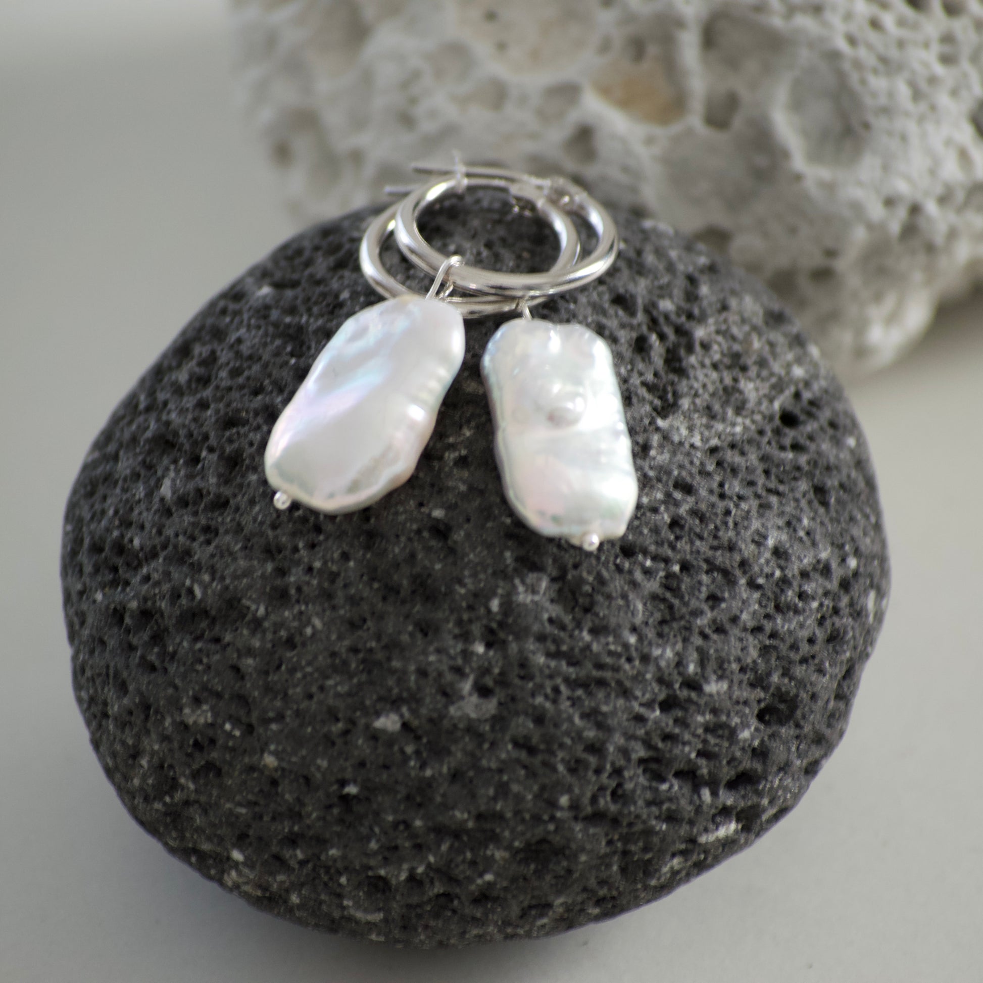 Hoop earrings with snap closure in 925 silver and baroque pearl as pendant.