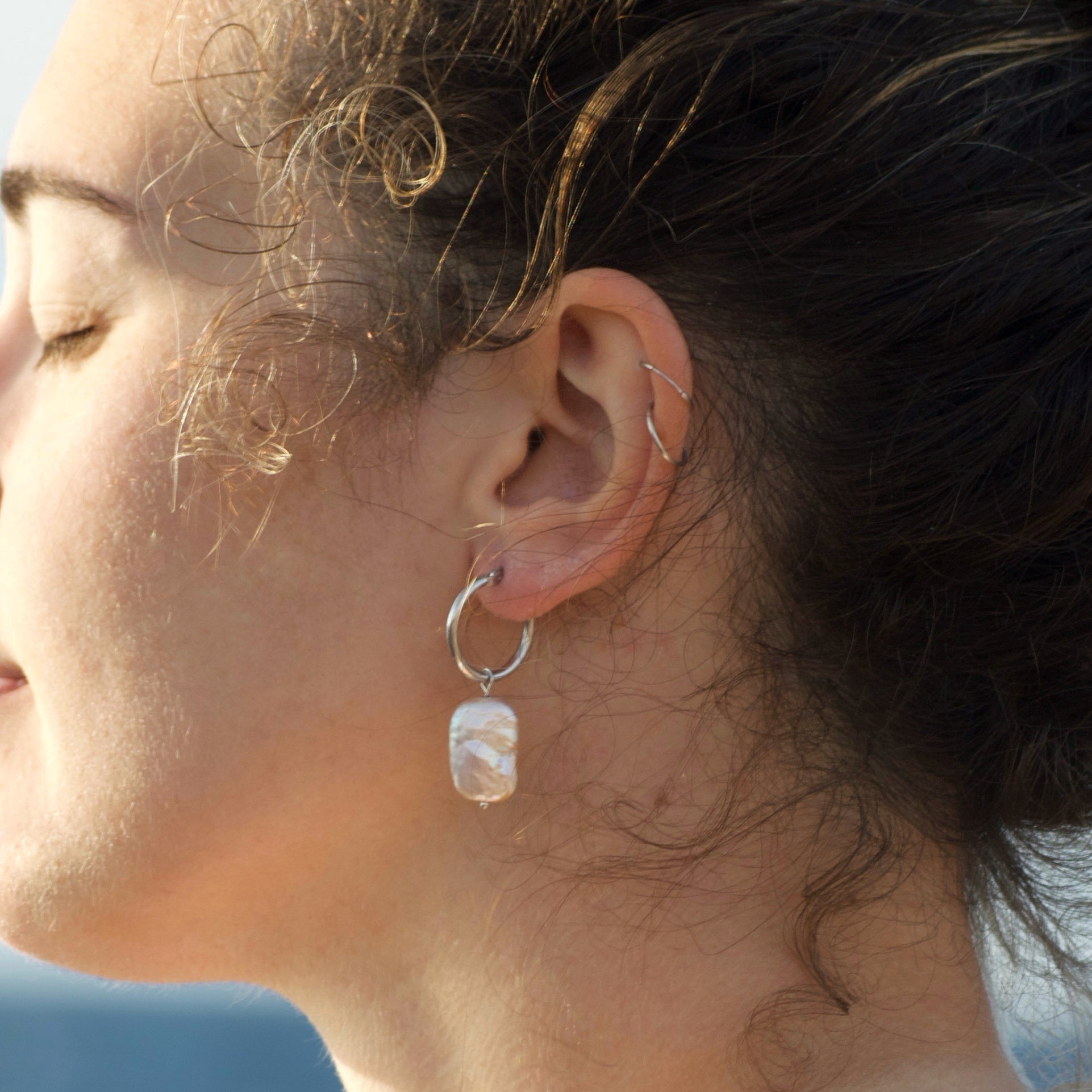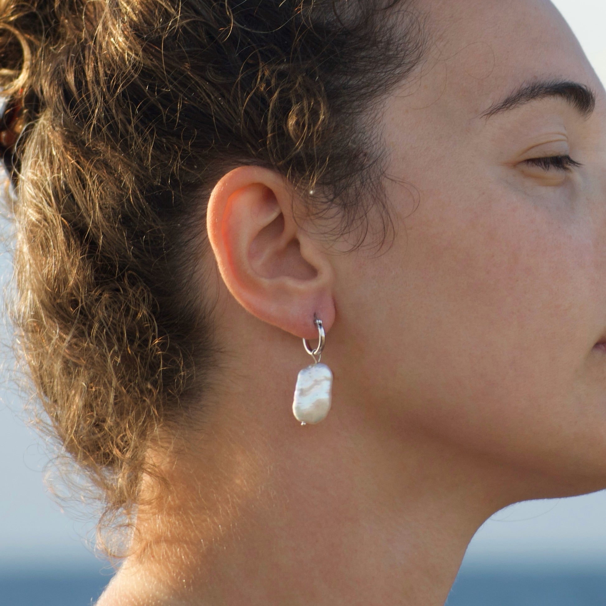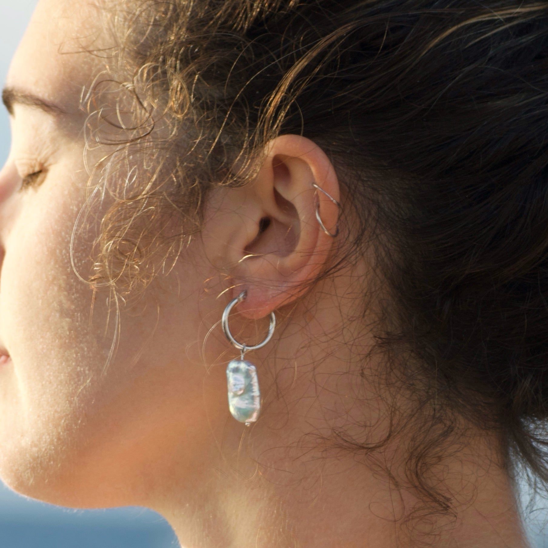 Hoop earrings with snap closure in 925 silver and baroque pearl as pendant.