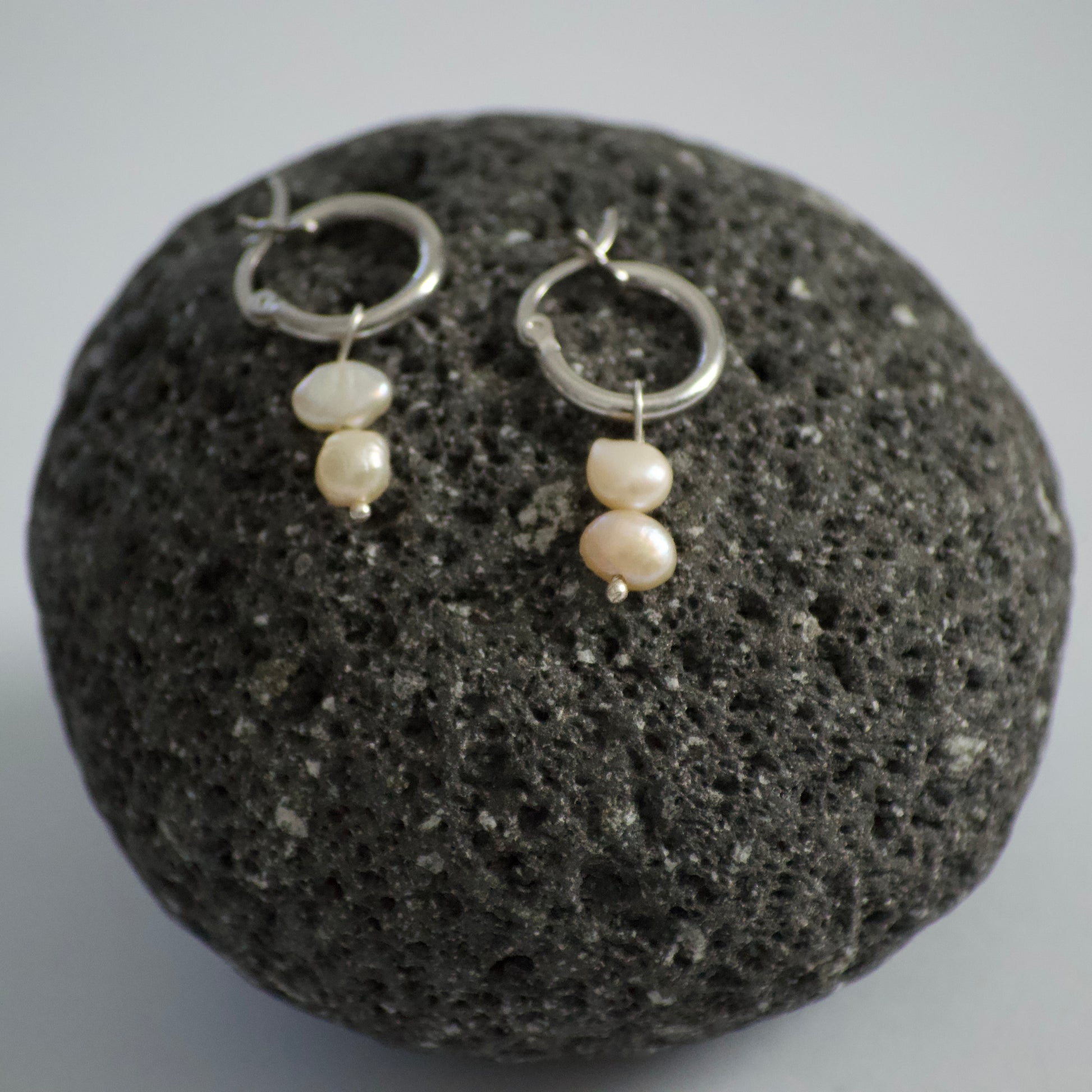925 silver snap-back hoop earrings with irregular pearls as pendant.